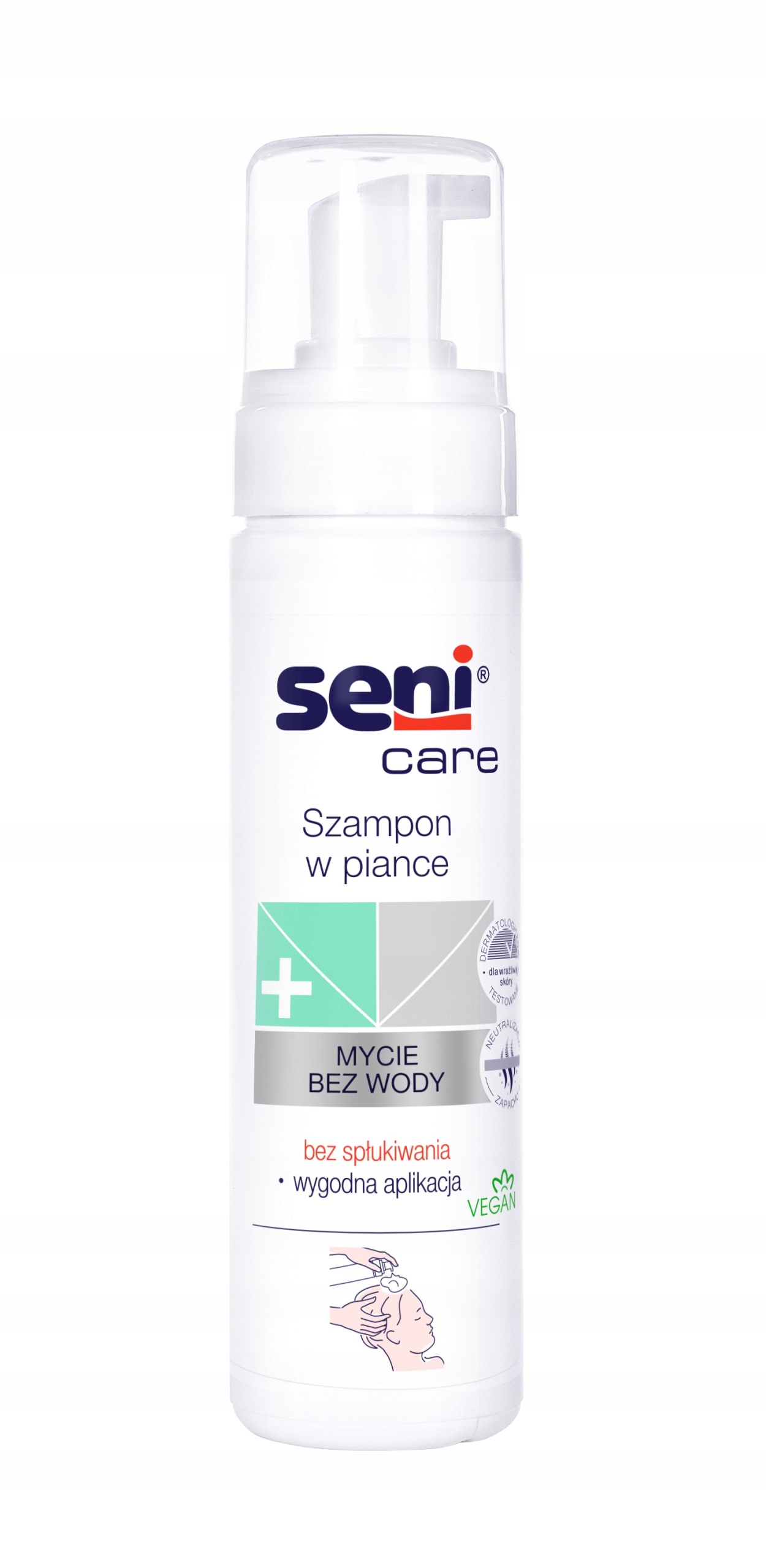 Szampon w piance Seni Care do mycia suchej, wrażliwiej i podrażnionej skóry głowy oraz włosów bez użycia wody.