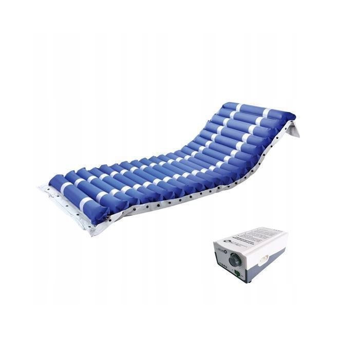 Materac przeciwodleżynowy pneumatyczny rurowy w zestawie wraz z wydajną pompą zmiennociśnieniową z regulacją ciśnienia dla pacjentów o maksymalnej wadze 150 kg.