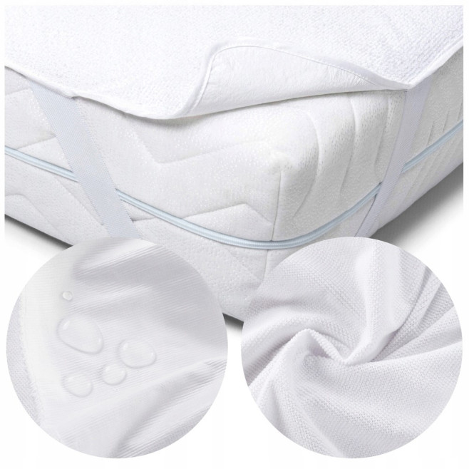 Starannie wykonany przyjemny w dotyku, nieprzemakalny ochraniacz na materac, ochroni Twoje łóżko przed zabrudzeniami oraz wilgocią dzięki środkowej warstwie poliuretanowej, która nie przepuszcza wody.