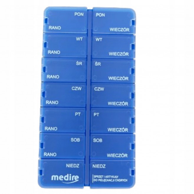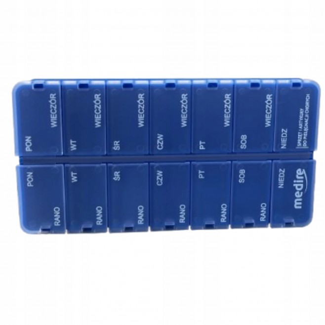 2-komorowa kasetka do dawkowania leków, pozwala na stosowanie leków o właściwej porze dnia i we właściwej dawce. Kasetka 2-komorowa na leki to wyrób umożliwiający bezpieczne przechowywanie tabletek na dany dzień i zastosowanie ich o odpowiedniej porze (zgodnie z zaleceniami lekarza). Polecany osobom regularnie przyjmującym leki.